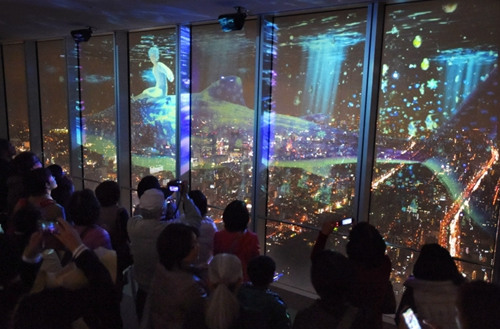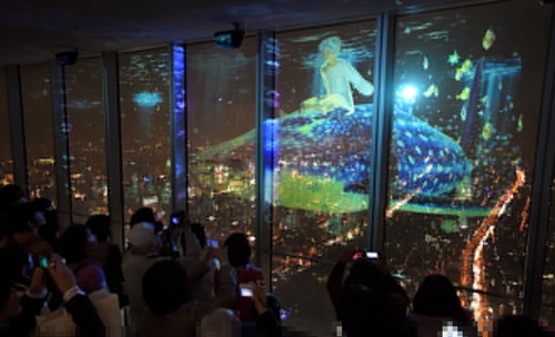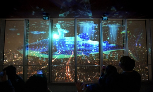 在300米高的展望臺觀景玻璃上,貼上特殊材質膠片,再將海洋生物等3D影像投射在上面,就可呈現夢幻般的畫面。