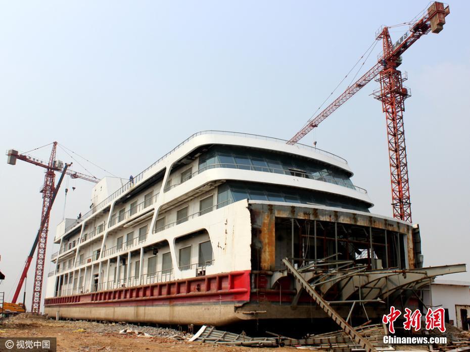 2016年10月12日消息,因為無法通過環評,鎮江城投投資5000萬元打造的“鎮江號”游輪,一直孤苦伶仃的在鎮江長江內江江面漂浮,如同“孤魂野鬼”。還是早在2007年,揚子晚報記者《5000萬建餐飲游輪》,就曾關注“鎮江號”;2010年,一篇《鎮江耗資5000萬游輪未通過環評 孤獨浮水面》的報道,更是將“鎮江號”游輪推至風暴中心,引發廣泛關注和諸多詬病。圖為改造中的“鎮江號”游輪。圖片來源:視覺中國