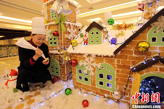 12月18日,江西省瑞昌市一酒店用1001塊姜汁餅干做成了一個高2米、寬3米的圣誕姜餅屋,為即將到來的圣誕節營造出濃厚的節日氣氛。中新社發 魏東升 攝