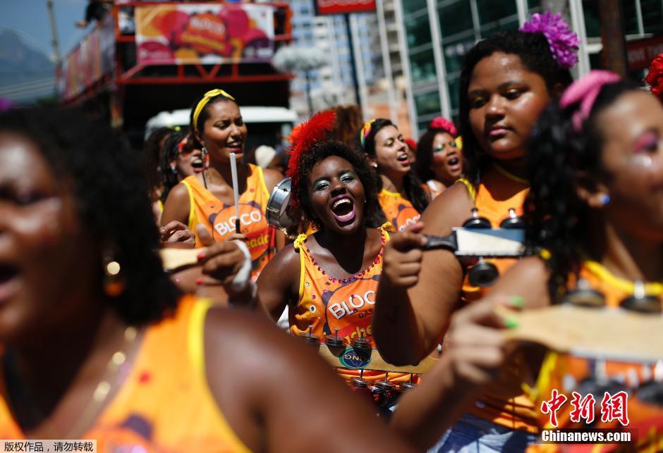 當地時間2015年2月8日,巴西里約,狂歡者參加游行為巴西狂歡節舉行的預熱活動。據悉,巴西狂歡節將于2月15日開始。