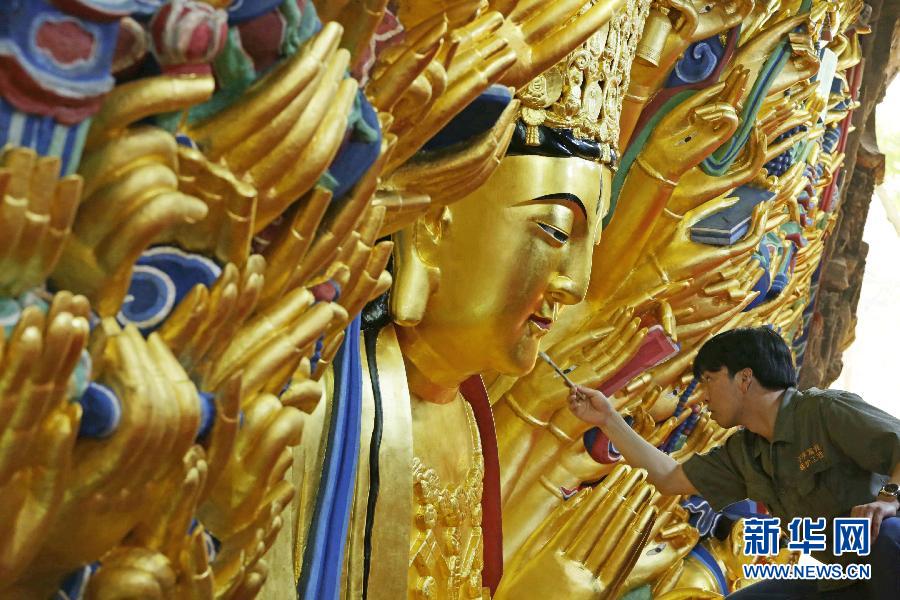 3月31日,在重慶市大足區寶頂山千手觀音造像修復工程現場,工作人員為造像表面刷封護劑。封護劑就像“護膚霜”,能夠對千手觀音的“皮膚”起到很好的保護作用,也有利于今后對造像表面的清潔。目前,重慶大足千手觀音造像修復工程的石質、彩繪和貼金等主體修復均已完成,修復工程進入最后的“護膚”階段。按照計劃,修復后的千手觀音造像將于2015年6月正式竣工,與游客見面。新華社發(羅國家 攝)