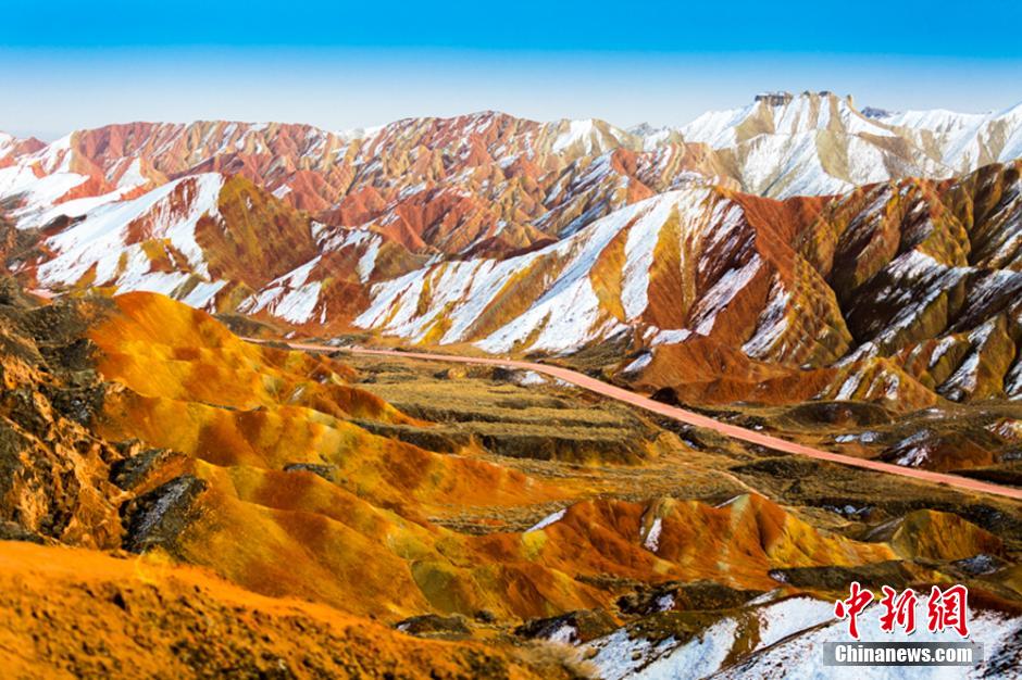 4月4日,一場雨夾雪將位于甘肅張掖的丹霞地貌“洗滌”得格外清新。雨雪過后,原本五彩斑讕的張掖丹霞山體在白雪覆蓋下分外妖嬈,猶如一幅幅美妙畫卷。甘肅張掖丹霞地貌發育于距今約200萬年的前侏羅紀至第三紀,主要由紅色礫石、砂巖和泥巖組成,有明顯的干旱、半干旱氣候的印跡,以交錯層理、四壁陡峭、垂直節理、色彩斑斕而示奇。王曉霞 攝