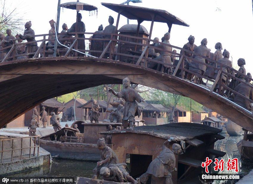 2015年4月20日,河北唐山,《清明上河圖》泥塑園是由河北省唐山市當地一位農民企業家投入資金1.5億元建成的。整個泥塑園中共包括500多個形態各異的人物、50余只牲畜、20余條船和30余間宋代民居以及橋梁、城樓等泥塑作品。許多人物好似在奔跑,栩栩如生,個個活靈活現。據悉,該泥塑《清明上河圖》將申請世界記錄。圖片來源:CFP視覺中國