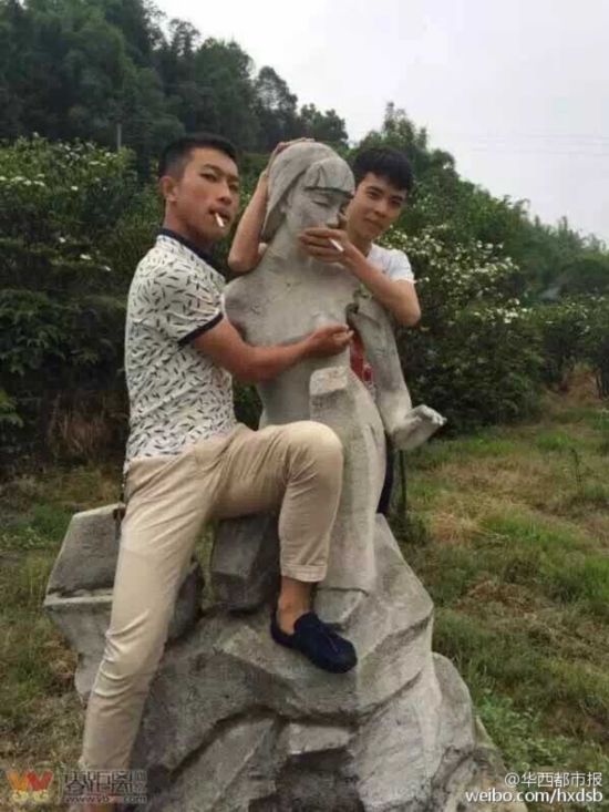 5月20日報道,陜西宜賓趙場佛現山景區梔子花花開正艷,但近日卻出現了與美景相悖的不文明行為,只見照片中兩男子對一婦女雕像又是摟抱又是摸胸,實在煞風景。記者了解到,雕像是兩年前計生文化進景區時設置的。目前,拍攝時間和兩男子身份尚不明確。