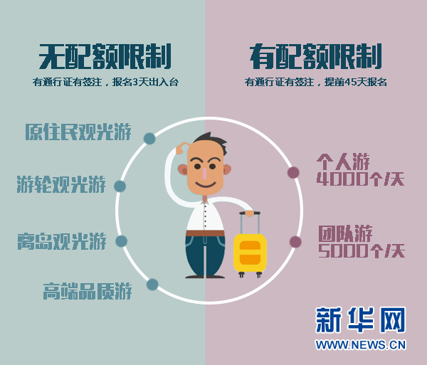 目前臺灣方面對大陸游客實行配額政策,2015年,每天團隊配額是5000個,由全國各個旅行社共享;每天個人游配額是4000個,由47個開放自由行的城市共享。每天9000個入臺配額對于數量龐大的入臺客源來說,無異于杯水車薪。