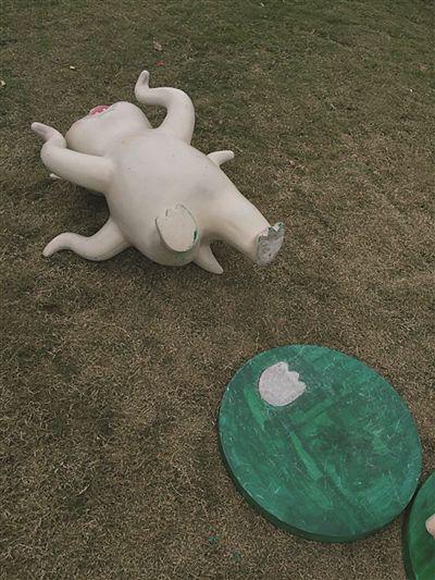 網友“雯寶貝520”:昨天去玩,看見一個小孩子手里拿塊磚頭在每個卡通娃娃身上砸一遍,大人就在旁邊,也不管。唉,真心無語!