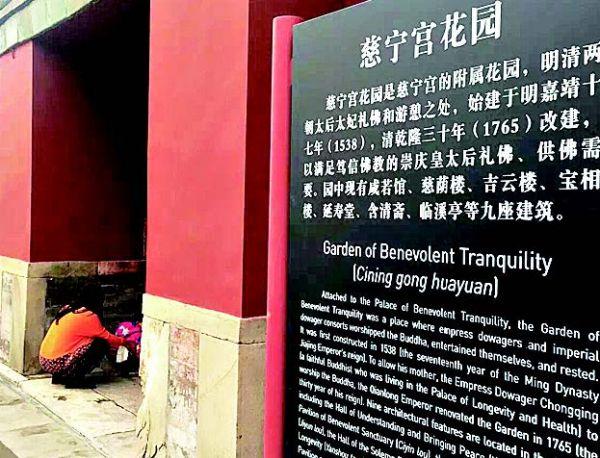 據香港《成報》網站10月25日報道,網上流傳的照片顯示,一名女游客帶著孩子在慈寧宮門口蹲地疑似方便,而右側有“慈寧宮花園”的標識。網友怒批,“慈寧宮門口便便,你不怕陰氣太重啊”。不少認證為文博界人士的網友也嘲諷,“開放還不到兩周,就為我大慈寧花園施肥來了”。也有博物館工作人員留言,“我們博物館園區里也遇到過,簡直無語”。
