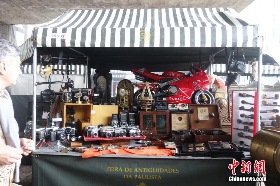 巴西圣保羅保利斯塔大街有一個周日古玩集市,只星期日開張,這里擺賣的古玩有瓷器、銀器、燈飾、舊款相機、老款留聲機、舊鐘表等,品類繁多,吸引了眾多顧客,生意紅火。圖為:11月1日一位顧客在一個舊款相機攤位前走過。
