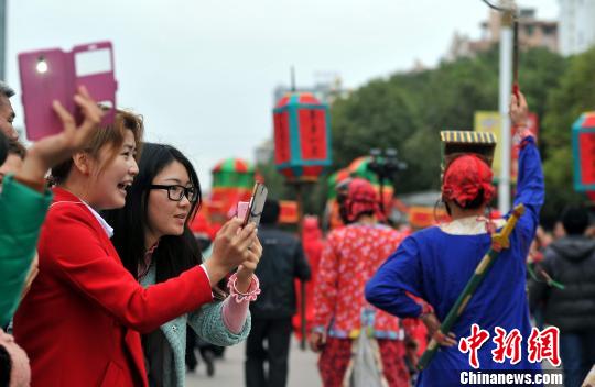 11月10日下午,一場集合了眾多民間特色藝術的“踩街”表演在江西省南豐縣舉行。“踩街”表演中,最具南豐特色的“千年儺舞”走在隊伍的最前面,無論是神態各異的儺面具,還是原生態的舞蹈動作,都讓人眼前一亮。當天縣城萬里空巷,吸引了沿街萬余民眾感受民俗文化的獨特魅力。據介紹,“踩街”是一種求吉祈福的民俗花會表演形式,包括舞龍、舞獅、儺舞、旱船、秧歌等多種民間藝術,邊走邊演。