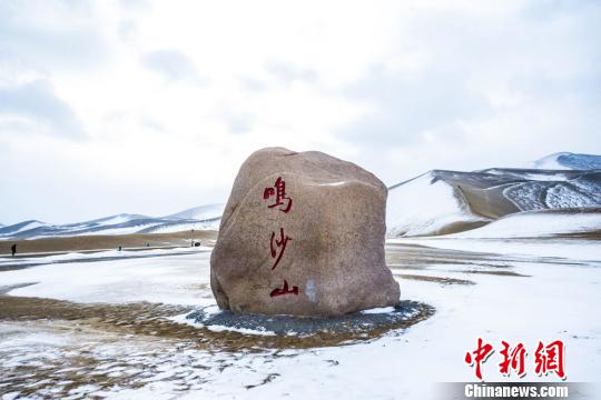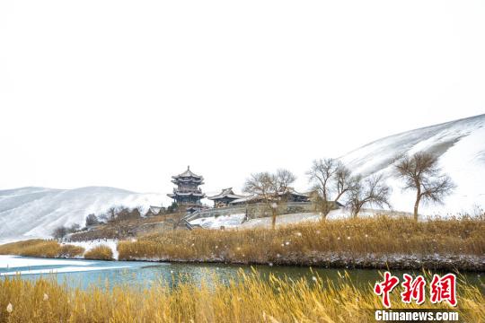 12月12日,國際旅游名城甘肅敦煌迎降雪天氣。圖為當地著名旅游景點鳴沙山月牙泉一片銀裝素裹!⊥醣筱y 攝