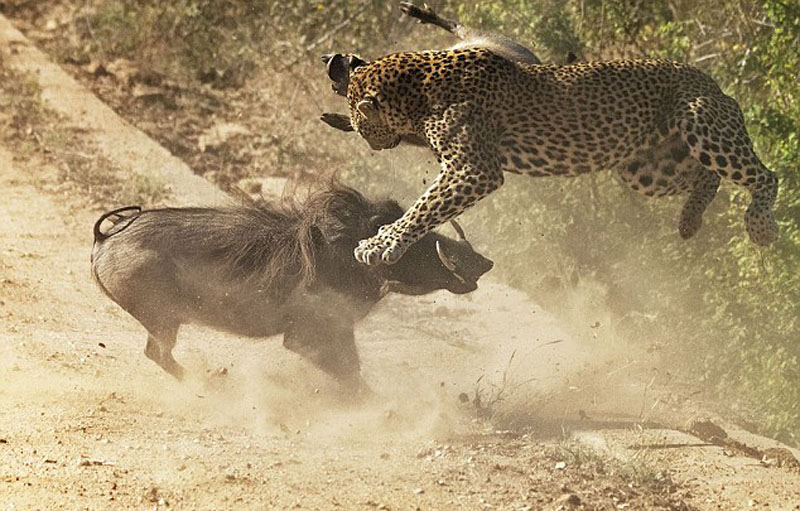 福里說:“花豹突然出現,咬住一頭小疣豬的脖子。小疣豬努力掙扎尖叫,試圖逃離花豹的大嘴。緊接著,疣豬媽媽從汽車后面急速沖來,用頭猛撞花豹的胸腔。當它再次轉身沖來,花豹被迫放棄抓到的小疣豬。疣豬媽媽將花豹追入公路旁的涵洞附近,然后轉身逃離,花豹向我咆哮。”