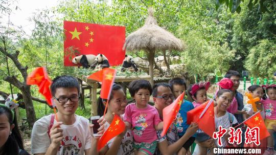 10月1日,廣州長隆野生動物世界舉行“全球國寶總動員”國慶派對,小朋友們舉著揮舞國旗,與全球唯一大熊貓三胞胎合影,慶祝新中國成立67周年。中新社記者 王華 攝