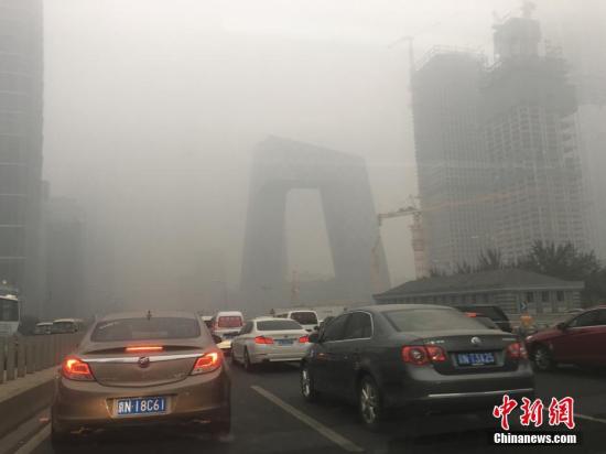 10月19日消息,昨天16時,北京市氣象臺發布霾黃色預警信號,預計昨日傍晚至19日北京大部地區有中度霾,南部地區有重度霾。圖為國貿附近被霧霾籠罩,能見度降低。富田 攝
