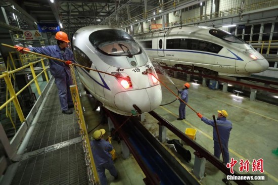 1月8日晚,一列和諧號(hào)高鐵列車緩慢駛?cè)肷虾:鐦騽?dòng)車運(yùn)用所,車頭部分沾滿了厚厚的“霧霾妝”,在列車入庫前除了對(duì)外皮自動(dòng)清洗外,車頭部分還需人工特別精洗“卸妝”,一趟400米的長(zhǎng)編列車清洗完畢大約需要45分鐘,每組工人一晚要清洗20多個(gè)“霧霾車頭”,直到清晨。圖為工作人員為高鐵車頭洗刷刷。中新社記者 張亨偉 攝