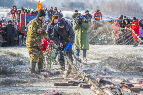 此次冬捕活動將持續到二月份,期間游客不但可以參與冬捕全過程,也可以參觀并親自體驗小網掛魚或冰上釣魚、加工、烹制美味湖魚,還可以品嘗由漁公漁婆現場做鐵鍋燉魚、魚火鍋、全魚宴等純正的鏡泊湖漁家宴。