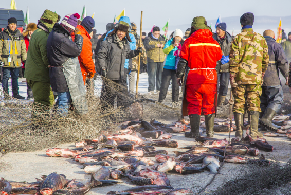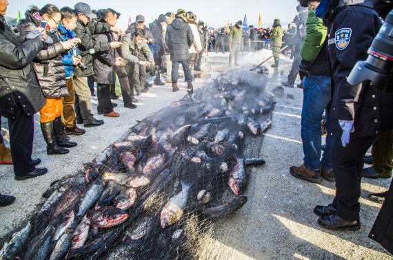 2017年1月6日上午,鏡泊湖面冰連岸,百里長湖鼓震天,第六屆鏡泊湖冬捕節在鏡泊湖西湖岫冰面正式拉開了帷幕。本屆鏡泊湖冬捕節最具亮點的當屬“頭魚放生儀式”,魚總將把頭網內最大的頭魚在放生口重新放歸冰湖,以感恩大自然對人類慷慨的饋贈。這是鏡泊湖有別于傳統的“頭魚點金、頭魚競價”等商業宣傳形式而進行的首次“頭魚放生”儀式,有回歸本真、保護生態的寓意,也是對真正薩滿漁獵文化內涵的遵循和傳承。