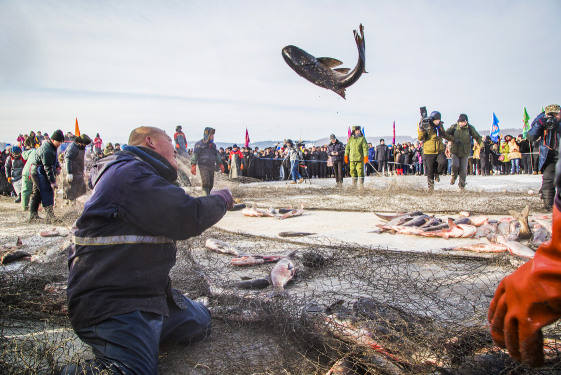 “冬捕節”的開幕式后,大家紛紛乘車,來到了距離開幕式現場約五公里外的“捕魚口”,觀看那最激動人心的“一大群活蹦亂跳的大魚被拉出冰面”的起網場面了。看看吧,在漁夫們高亢的號子聲中,拉網的馬輪子開始絞動,那張800多米長的大網從冰洞中漸漸滑出,頓時,伴隨著水氣洶涌而出的活蹦亂跳的胖頭魚、鯽魚、鯉魚等等,在冰面上的大網里翻滾著、跳躍著......
