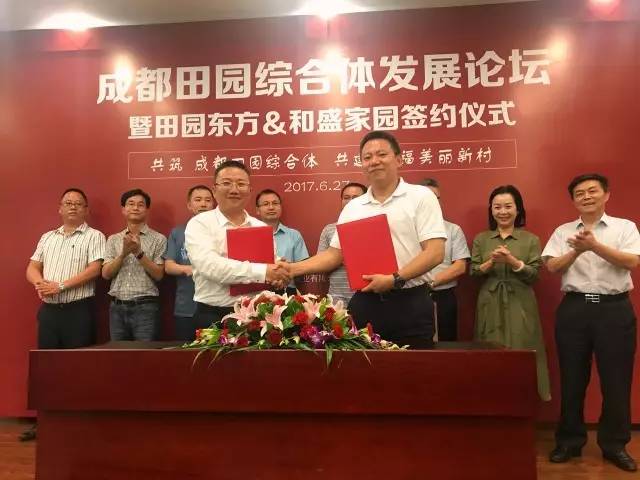 在論壇結束后,田園東方與和盛家園,就成都相關田園綜合體項目開發達成戰略合作并簽約。田園東方與和盛家園將共同在成都天府新區、青白江區進行田園綜合體探索實踐,深化推進成都統籌城鄉協同發展,建設幸福美麗鄉村。田園東方創始人兼CEO張誠,和盛家園董事長胡林代表雙方簽約。