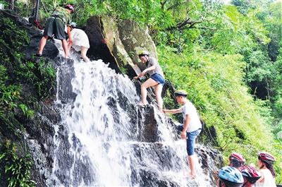 游客在呀諾達體驗“踏瀑戲水”。 本報記者 武威 攝